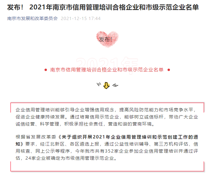 我司2021年12月通過南京市信用管理培訓(xùn)合格企業(yè)。