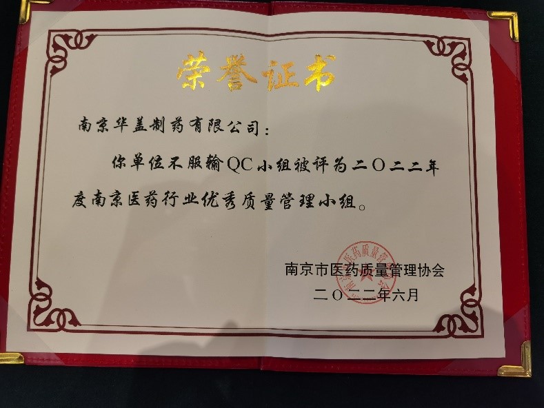 華蓋制藥“不服輸QC小組”獲評(píng)南京醫(yī)藥行業(yè)優(yōu)秀質(zhì)量管理小組
