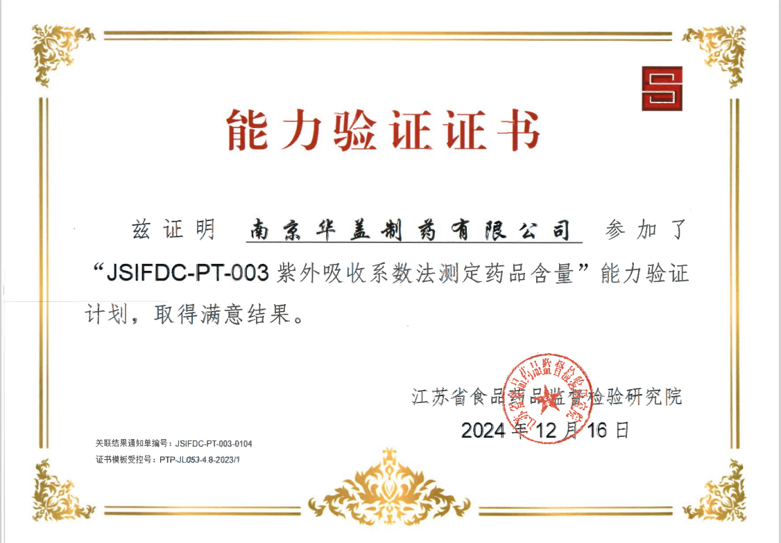 南京華蓋制藥質量控制實驗室參加了2024年度江蘇省食品藥品監(jiān)督檢驗研究院JSIFDC-PT-003紫外吸收系數(shù)法測定藥品含量、JSIFDC-PT-00高效液相色譜法測定藥品含量兩項能力驗證,并于2024年12月23日收到兩份能力驗證證書和結果通知單,兩項能力驗證均取得滿意結果!
